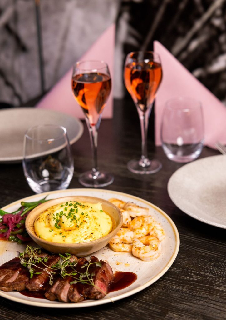 Grillattua flanksteakia, marinoituja jättikatkarapuja, chilillä maustettua papu-punasipulisalaattia ja perunapyreetä